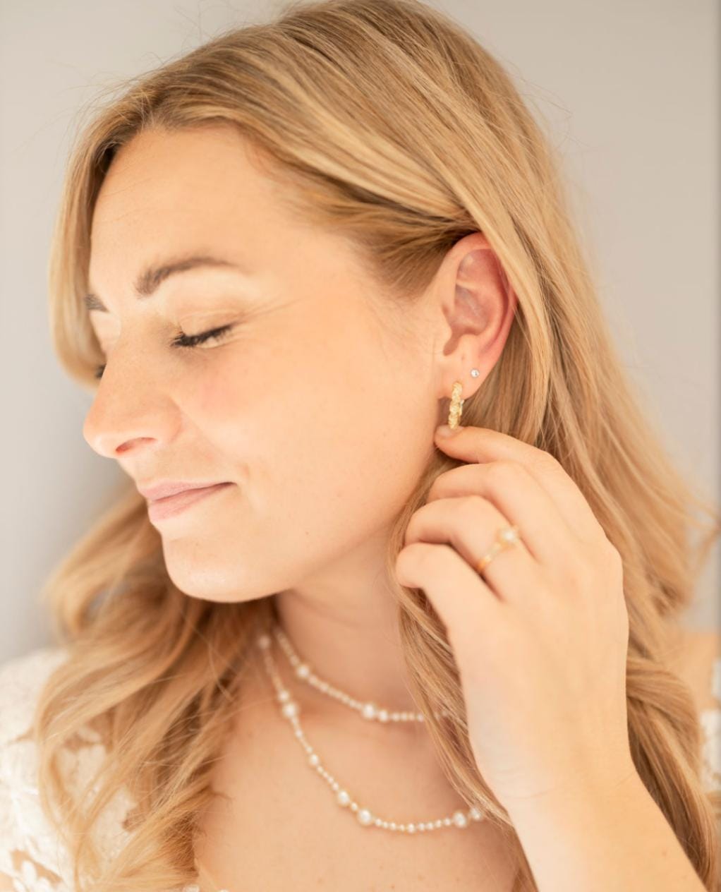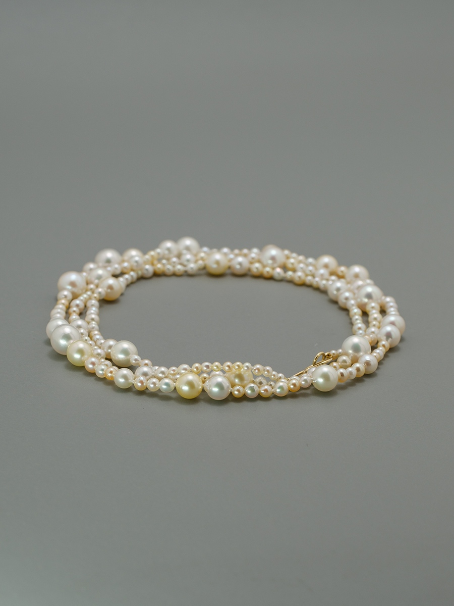 Die schimmernde Akoyaperlenkette zeichnet sich durch zahlreiche kleine und grössere Perlen aus, die sich in creme und Goldtönen abwechseln. Sie ist auf eine Perlseide aufgezogen und durchgeknüpft, d.h. hinter jeder Perle sitzt ein kleiner Knoten.